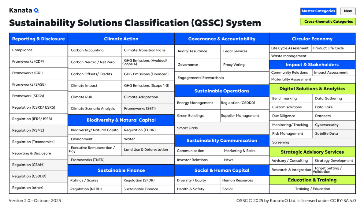 The QSSC System underpins how KanataQ structures and analyzes over 400 sustainability solution providers on our platform - and serves as an open standard for mapping the entire sustainability solutions ecosystem.